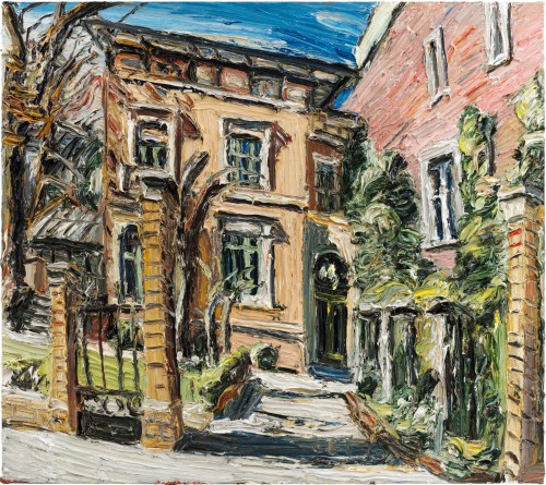 Der renommierte Berliner Künstler Christopher Lehmpfuhl ist bekannt für seine lebendigen, pastos mit den Händen vor Ort gemalten Gemälde. Das Bild "Sonniges Literaturcafé, Fasanenstraße" (2017, 160 x 180 cm) fängt die einzigartige Atmosphäre des Literaturhauses eindrucksvoll ein und zeigt Café und Garten an einem sonnigen Sommernachmittag.