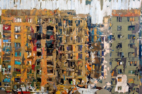 Tammam Azzam received his artistic training from the Faculty of Fine Arts at the University of Damascus. Following the Syrian Civil War, he relocated to Dubai where he began working in digital photomontages. In 2016 Azzam moved to Germany, with a residency at the Institute of Advanced Studies in Delmenhorst. In Delmenhorst and later in Berlin the artist began exploring a new technique in paper-collage alongside his paintings. His fragmented compositions highlight the physical remnants of conflict and showcase the importance to rebuild and create from destruction.