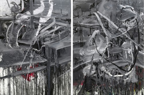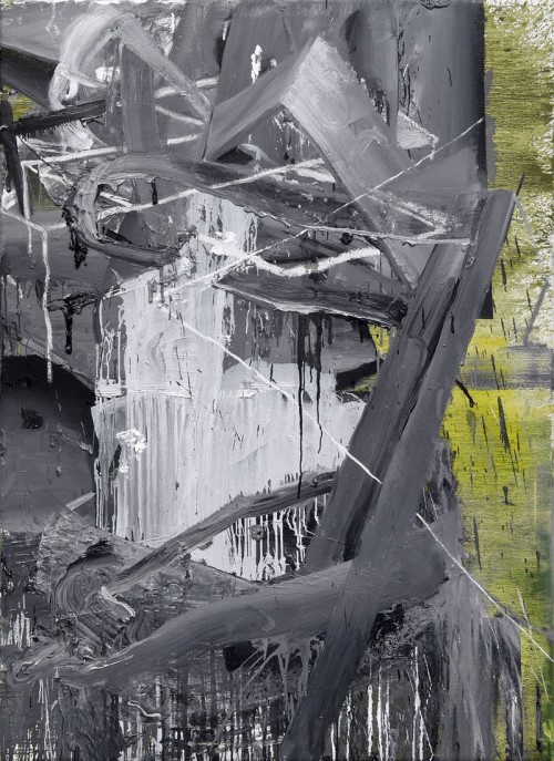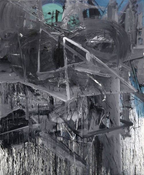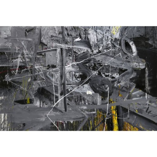 Seemingly abandoned factories and obsolete machinery have always been pivotal themes in Leonardo Silaghi’s paintings. His complex canvases depict industrial and visceral backgrounds in grey that are interspersed with jubilant sweeps of colour. His latest work has moved away from the immediacy of figurative into more abstract renderings, preserving the feeling of dense metallic structures and industrial remains, though not depicted in a figurative manner. Observing and photographing the omnipresence of structures, devices or tools in his environment, Silaghi explores the correlation of objects and illusion of space, as well as the boundaries of paint as a medium.