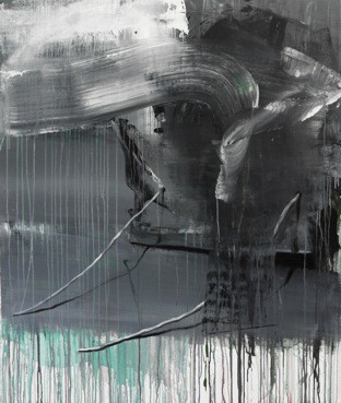 The figurative paintings by Leonardo Silaghi unite seemingly unfinished, gestural-expressive sections with elaborately detailed areas. Heavy gray machines are placed within the picture in a unique way. Colored accents appear in contrast to a broad pallet of different gray tones.
